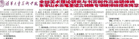 清华美院书画高研班是清华大学美术学院开办的唯一以导师专项研修班的形式开展书画高端教育培训的高研班,以公共理论课、公共基础课横向课程体系与导师专业课〔含写生(采风)、创作课程〕纵向课程体系相结合的方式,开创高端研修班全新的教学体系。本高研班目前已成功开班15期,结业学员达2300余人次,在校学员300余人。