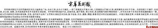 京华美术馆的联合机构包括:中国艺术报道编辑部、艺术视野编辑部、艺报网、北京艺报国际文化传媒有限公司、河北美术学院名家工作室、当代最具学术价值与市场潜力的艺术家系列活动组委会、中国画名家巡回展组委会、画家中的书法家系列活动组委会等。京华美术馆将成为北京艺报国际文化传媒集团开展文化艺术交流活动的重要基地,北京艺报国际文化传媒集团将以此为依托,为文化界、艺术界、收藏界、企业界等领域的单位、机构、人士提供艺术交流的平台,资源拓展的空间,展览收藏的场地,文化休闲的场所,全力打造一个专业的文化艺术之家。诚邀艺术家、艺术机构来京华美术馆举办展览和论坛。 电话:010-88635223