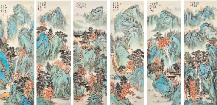 王健峰 松响石林秋青绿山水六条屏
