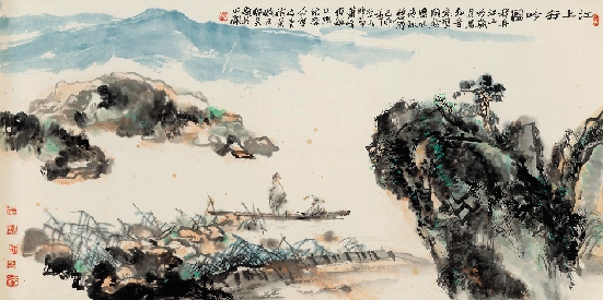 肖峰、王伯敏、叶尚青、吴山明、叶培荣五人合作 江上行吟图 67×136cm