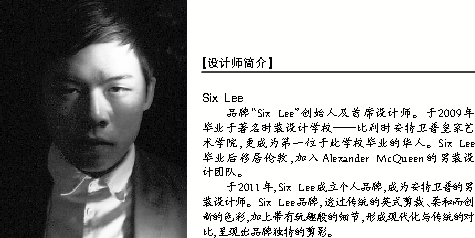 于2011年,Six Lee成立个人品牌,成为安特卫普的男装设计师。Six Lee品牌,透过传统的英式剪裁、柔和而创新的色彩,加上带有玩趣般的细节,形成现代化与传统的对比,呈现出品牌独特的剪影。