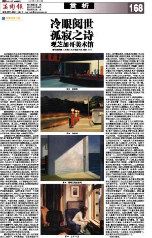 在空荡荡的芝加哥美术馆里参观霍珀的画真有点情景交融的感觉,特别是当我面对着他的那幅《夜游客》的时候,一种孤寂冷漠的感觉更加深重。位居美国第三的芝加哥美术馆庞大无比,把进入的少数观众全部吞没,不见踪影,只能听到在硬石地面上传来的清脆足音。光线斜斜地从窗外射进,照得美术馆里光影迷离,阴阳分明,那些举世的名作们都静静地挂在冷白的墙上,无言地诉说着它们身上蕴积着的古老故事。