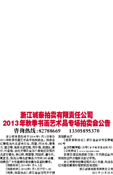 本公司受委托将于2014年1月5日举办2013年秋季书画艺术品专场拍卖会。拍卖会汇集现当代名家宋文治、范曾、何水法、唐勇力、曾宓等,海派名家汪锟、郑午昌、来楚生、唐云、沙孟海、余任天等及金华八婺地区近现代名家方增先、吴山明、蒋莲僧、郑祖纬、童子风、夏家丞、陈尧山等名家精品力作共300余幅,将满足广大书画爱好者收藏与品鉴的需求。