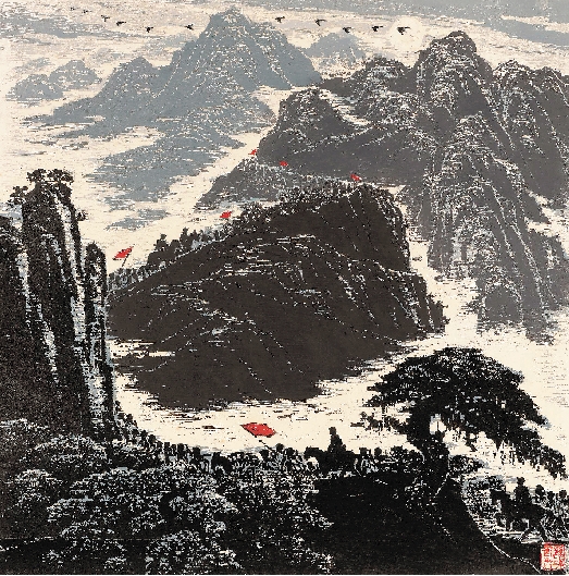 罗映球 长空雁叫霜晨月 62×61cm 油印套色木刻 2002年
