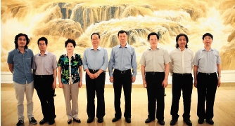 从左至右分别为:徐惠君,江阴市委常委、宣传部长袁秋中,江苏省文联党组书记王慧芬,全国政协原副主席张怀西,全国政协副主席陈晓光,民盟中央副主席张平,中国美术家协会副主席吴为山,江阴市市长沈建