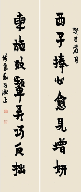 张良勋 隶书对联 132×33cm×2 西子捧心,愈见增妍;东施效颦,弄巧反拙。
