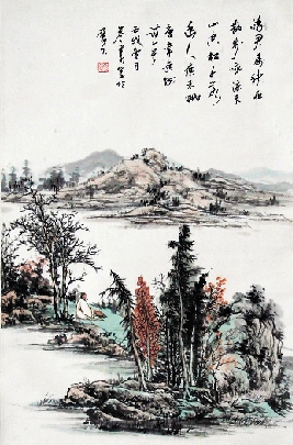 胡苓业(山东) 对江抚琴图 中国画