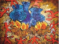外圈以红黄两色为主表现了丰收的热烈气氛,而中间采用蓝色又形成了视觉上的冷暖对比。
