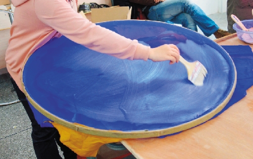 ◀ 给绷伞上架前的伞面上一层均匀不花的浆,为伞面绘画作一层易画的辅助底。