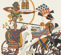 埃及法老拉美西斯二世在马拉的战车上弯弓搭箭杀敌的壁画