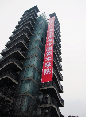 中国美术学院象山校区最高的7号楼上,悬挂了大大的条幅。
