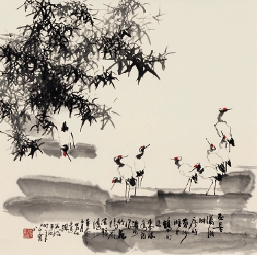 杨如及 正是潇湘时序好,黄沙滩上鹤回辽。东流水陌淘沙浪,竹苑清风天籁涛。 69×69cm