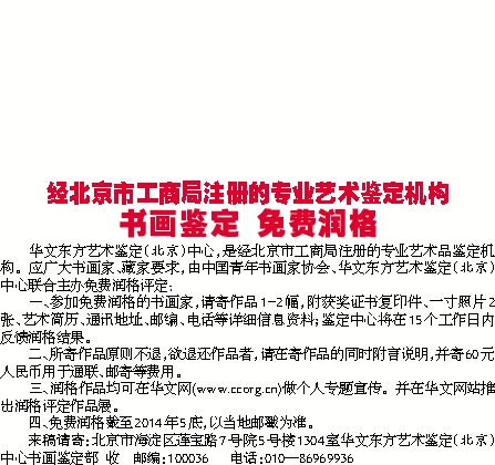 华文东方艺术鉴定(北京)中心,是经北京市工商局注册的专业艺术品鉴定机构。应广大书画家、藏家要求,由中国青年书画家协会、华文东方艺术鉴定(北京)中心联合主办免费润格评定: