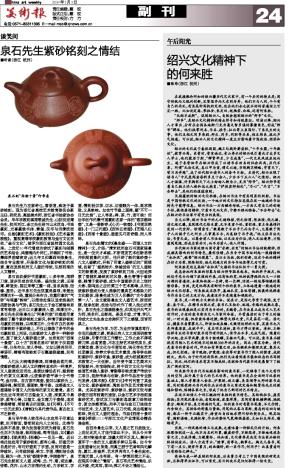 泉石先生撍文的《曼生壶——西湖人文的精神》一文,介绍:“清末杭州金石书画家陈曼生,是一位天才卓越,不断萌发艺术创新思想并积阔前景的大师。他开辟了新的紫砂壶十八文人壶款式,开拓了印章入壶铭记的广阔领域,创新了‘超然物外、穿越世俗’的文人壶铭文的新意境,发展了紫砂铭刻刀法,大胆地探索了壶随机缘铭刻的风格,曼生寄情于紫砂壶、融情于紫砂壶,成为中国紫砂历史上继时大彬、陈鸣远之后的第三个艺术高峰,从而也使紫砂壶成为受人推崇的最具艺术感染力的文化载体,陈曼生成为万人仰慕的“古今紫砂第一人”。全文就陈曼生文人壶艺术,浙派流源,继承创新,技法与形式作了深入浅出的赏析。泉石先生之推崇陈曼生,仰其但开风气不为师,淡名利,出新局。是因乡谊、才情、学识,抑或大丈夫生身立命胸怀天下之感慨,因皆而俱之。