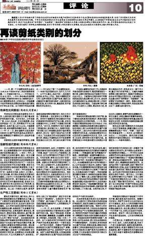 编者按:2月8日评论版刊登了乔晓光先生《作为非物质文化遗产的剪纸艺术》和陈巨中先生《剪纸类别划分的设想》两篇文章,讨论了当今剪纸艺术在传承发展等方面面临的有关问题。中华文化促进会剪纸艺术专业委员会主任张树贤先生看过文章后即撰文,认为根据《中华剪纸》杂志自去年开展的这方面问题的讨论中,陈巨中先生提出的“西洋剪纸”、“民族剪纸”、“通俗剪纸”的设想与大多数人的意见和群众习惯性的称呼并不一致,并对剪纸类别的划分发表了不同看法。从中我们看到了两种观点的精彩碰撞,这对于学术的深入研究和探讨大有裨益,这也是本期再次刊登剪纸主题文章的意义所在。