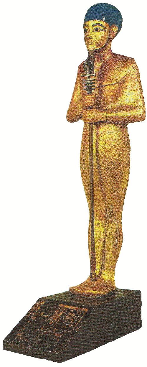 图坦卡蒙墓里殉葬的一尊神像,是在乌木的外部贴满了真金箔制成,头发上镶嵌着青金石。