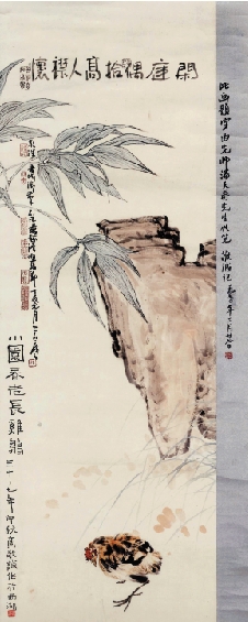 商敬诚 小园春老长鸡雏(潘天寿、曾宓题款) 105×34cm 1949年