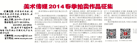 2014年,美术传媒拍卖将乘胜追击,继续秉承“以传媒的力量,推动艺术品市场的健康发展”的宗旨,致力服务于藏家艺术家,实现双赢。美术传媒2014春季拍卖作品征集自今年2月份正式拉开帷幕至今,已受到众多老藏家朋友的大力支持。