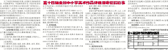 为了我国艺术教育的发展,在国家艺术教育委员会、中国教育学会、中国美术家协会、中国书法家协会、全国青少年艺术联合会等有关部门领导的关心、支持和帮助下,全国中小学美术作品评选活动已成功地举办了13年,受到了教育部、文化部及有关部门的高度评价和社会各界的热情关注,已成为我国艺术教育领域中较高规格的活动之一。