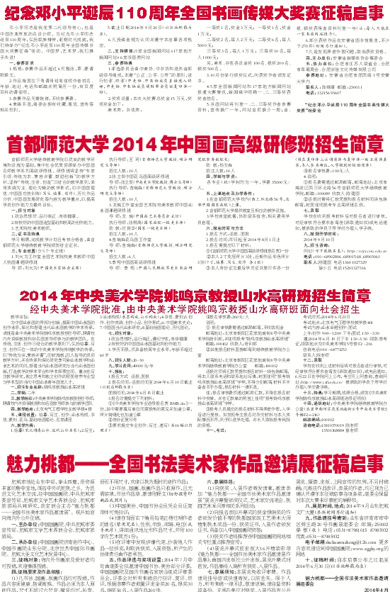 五、作品评选与奖项设置:2014年7月中旬由组委会拟邀请中国书协、美协部分评委,中国国画院及国内书画名家联合组成评审委员会,评委会对所有来稿进行初评、复评、终评,根据参赛作者数量评出金奖20名,银奖30名,铜奖50名,入展作品200件。