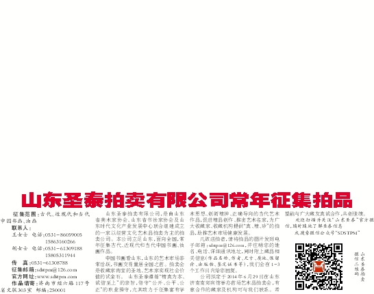 山东圣泰拍卖有限公司,是由山东省美术家协会、山东省书法家协会及山东时代文化产业发展中心联合组建成立的一家以经营文化艺术品拍卖为主的拍卖公司。本公司立足山东,面向全国,常年征集古代、近现代和当代中国书画、油画作品。