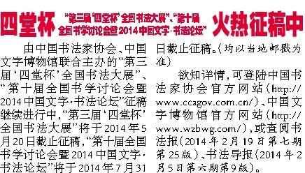 由中国书法家协会、中国文字博物馆联合主办的“第三届‘四堂杯’全国书法大展”、“第十届全国书学讨论会暨2014中国文字·书法论坛”征稿继续进行中,“第三届‘四堂杯’全国书法大展”将于2014年5月20日截止征稿,“第十届全国书学讨论会暨2014中国文字·书法论坛”将于2014年7月31日截止征稿。(均以当地邮戳为准)