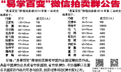 征稿:“易掌百变”微信拍卖群常年面向全国征集拍卖作品。具备中国美协会员或省市级画院、省市级美协、书协理事以及著名书画家的作品均可参与拍卖,拍卖结果将在《美术报》公布。