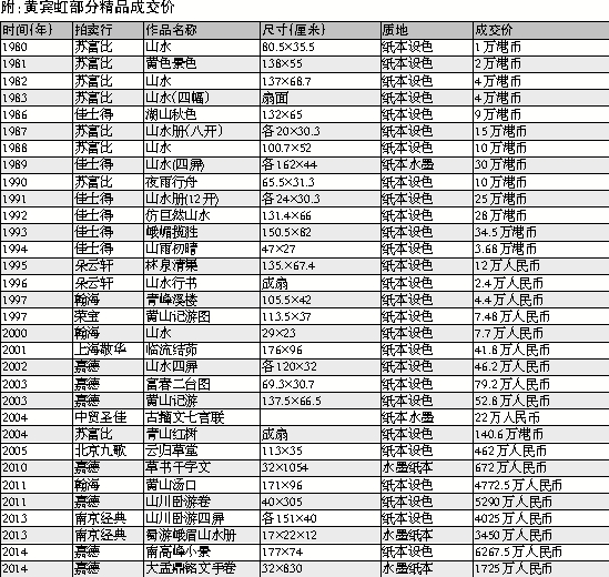 | 时间(年) | 拍卖行 | 作品名称 | 尺寸(厘米) | 质地 | 成交价 |