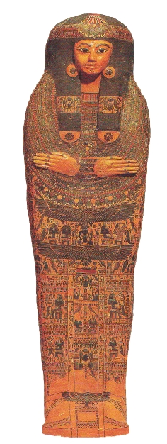 一口置放木乃伊的棺材盖,上面用彩绘画着死者的形象。