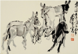 在动物题材作品中,我们总能见到黄胄趣味独特的笔墨,他选择的动物也多是人们日常生活中习见的,这固然有他喜爱的因素,也不能不说有为人物画服务的初衷,在他或巨制或小品的人物画中,多有点缀动物,无不活灵活现,可见功不唐捐。 毛驴是黄胄下大力气研究的题材,造型熟稔,笔墨精妙,达到了炉火纯青的境界。黄胄熟悉驴、喜欢驴、爱画驴,他在题画中多次表达对驴的喜爱之情,“虽不及牛马高贵,却能经风雨、耐霜雪,忍辱负重,辛劳终生,憨绝痴绝。”我们看黄胄笔下的驴,总会觉得它们是那么可爱,尤其小驴,稚气未脱,憨态可掬,惹人怜爱,也正如黄胄所说:“小驴浑身是宝,勤苦温顺,经风耐雨,亦可任重道远,胡云不美!” 黄胄画驴原来也并非抱了“一招鲜,吃遍天”的打算,更重要的意义是练习笔墨。他画有多件《百驴图》,他在其中一件上题跋:“1979年于友谊医院落墨,1980年春节自新疆旅行返京,完工于三里河木斋。我画驴意在突破一点,掌握笔墨技法,像演员练基本功一样,但是由于笨,40年功夫,终难笔墨淋漓又备神形。画《百驴图》是一种尝试,想把平时练习集中起来,此系第六卷。18年前曾为邓拓同志写80余头,并因此获罪,此图亦失散。第二卷在八年前为一位大夫而作,均幼稚低劣。第三卷作于1978年,邓小平同志访日时赠给天皇裕仁。当时余在医院中,手僵骨疼,勉强成画,满心尽力为国家贡献力量,结果不很理想,思之应是终生憾事。此是第五卷,愈画愈知其难处,愈感自己笨拙,愈感自己不足,而此图费时已两载也。” 画驴而外,黄胄对多种动物(如鸡、鹅、狗、猪等家禽、家畜乃至鹤、鹰等)题材都下过功夫,不仅造型准确,而且善于撷取最生动 |