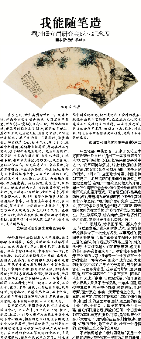 中国瓷都、粤菜之首广东潮州文化艺术方面近现代及当代也是出了一些很有意思的人物,西泠印社第七任社长饶宗颐即是其中之一。饶宗颐博学多才,能让他钦服的乡贤不太多,其父执(父亲的朋友)佃介眉是不多的例外。6月2日,全国政协常委、中国书协副主席苏士澍题耑的“潮州佃介眉研究会成立纪念展览”在潮州市群众文化馆火热开展,潮州佃介眉研究会会长、佃介眉长孙佃锐东等数百观众出席开幕式。配合展览的作品集也随展发行,曾楚楠为展览撰前言:“值先生冥诞百廿八年之际,‘潮州佃介眉研究会’正式成立,同仁特举办祝贺是会创建之书画展,藉志缅怀景仰先哲之挚忱,亦乡邦学苑艺坛之胜概也。先生学养深厚,法古尚新,虽命途多舛而处之泰然,复能怀德葆真且自强不息。”