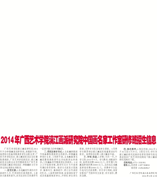 四、报名程序:1.报名时间:2014年4月16日至6月30日。2.报名方式:学员向漓江画派研究院教学部索取简章和报名表或登录广西艺术学院网站下漓江画派研究院网页下载。