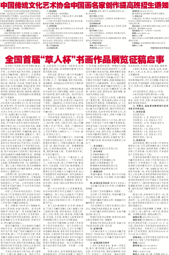 展览安排:拟请铜奖以上获奖作者和部分优秀获奖作者,于2014年 10 月 15日前,到北京草人艺术馆参加颁奖典礼和大型现场笔会。优秀奖以上作品装裱后在草人艺术馆展出,展出时间2014年10月16至18日(暂定)。