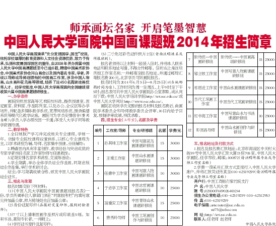 美术报 广告 00009 中国人民大学画院中国画课题班2014年招生简章 2014-06-14 美术报2014-06-1400011;美术报2014-06-1400013;美术报2014-06-1400012 2 2014年06月14日 星期六