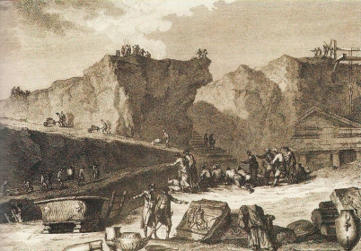 《挖掘庞贝》,创作于18世纪时的一幅铜版画,表现了当时的人们已经开始在庞贝的遗址上进行寻找挖掘。