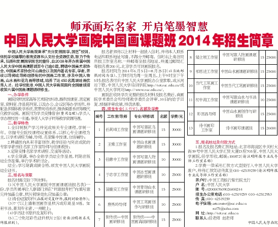 中国人民大学画院秉承“充分发扬国学、国艺”校训,依托学校雄厚的教育资源和人文社会资源优势,致力于传承、弘扬和发展国学国艺的重任,自2008年开办首届中国人民大学中国画课题班至今已逾6载,聘请中国美术家协会、中国美术家协会河山画会以及国内著名专家、学者,开设以导师或导师组领衔的中国画工作室,涉及中国人物画、山水画和花鸟画等领域,培养了近450名高端绘画优秀人才。经学校批准,中国人民大学画院面向全国继续招收第六届中国画课题班研修生。