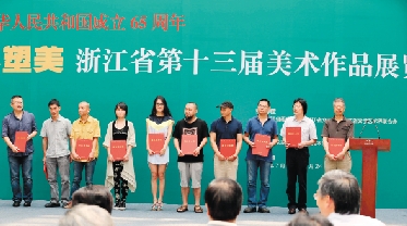 ◀浙江省第十三届美术作品展览各画种金奖获得者上台颁奖