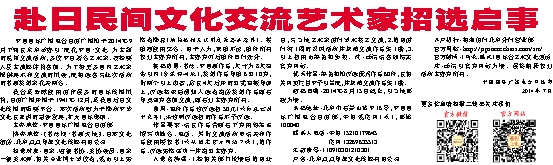 中国国际广播电台日语广播拟于2014年9月下旬在东京举办以“现代中国·文化”为主题的民间交流活动,多位中日著名艺术家、政经要人及主流媒体将参加。为了给更多国内艺术家提供展示和交流的机会,现招选参与此次活动的书画篆刻家代表两名。