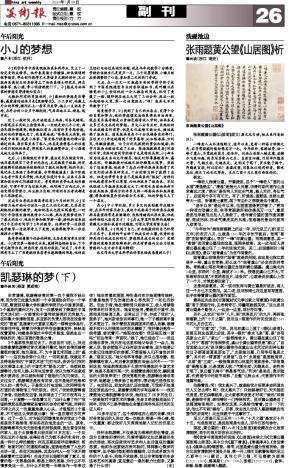 “今年秋仲”指张雨落款上的这一年,即元至正乙酉(至正五年)的农历八月,也就是1345年的中秋节前后。张雨“客游”在姑胥的虞山,寻访“一峰”即黄公望。有两层意思,其一“客游”说明黄公望住在这里,张雨来做客。这一点与后人讲黄公望在虞山住了20年的说法无异。其二,后面提到的8幅《山居图》,是以“姑胥虞山”为创作背景的。