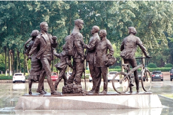 红色雕塑《永恒》,在表现题材上,选取了亲朋好友其乐融融“送新兵”的当代普通场景,诠释党和人民心连心,表现党的群众路线在沂蒙的实践和沂蒙精神的传承,以及沂蒙人的忠诚信念和精神追求的赤诚与永恒。在形象设计上,雕塑《永恒》以老大爷象征过去,新兵代表现在,小孩寓意未来,老大妈代表无私的奉献,拿手机的女孩体现关心与支持,摄像的夫妻象征着荣耀与自豪。手机、摄像机体现出新沂蒙时尚与现代的生活方式,自行车则倡导人们能践行环保低碳的生活方式。在表现手法上采用了浪漫现实主义风格,雕塑的整体构图组织、局部细节塑造以及造型提炼概括等方面,都进行了深度探究与反复实验。
