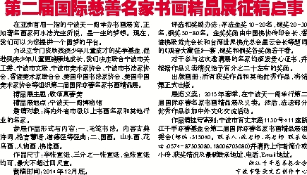 作品请挂号寄到:宁波市百丈东路1130号411室浙江千手慈善基金会第二届国际慈善名家书画精品展组委会(邮编:315040。联系人:沈老师、高老师 联系电话:0574-87303080、18006703080)并请附上作者简介或小传、获奖情况及最新联系地址、电话、Email地址。