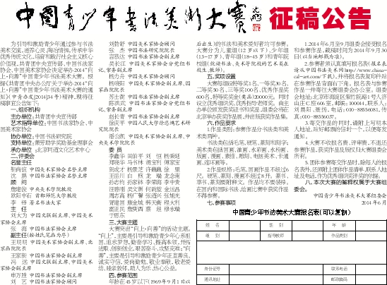 为引导和激励青少年通过参与书法美术交流,滋养心灵、陶冶情操,传承中华优秀传统文化,培育和践行社会主义核心价值观,共青团中央宣传部、中国书法家协会、中国美术家协会决定举办2014“向上·向善”中国青少年书法美术大赛。根据《共青团中央办公厅关于举办2014“向上·向善”中国青少年书法美术大赛的通知》(中青办发[2014]34号)精神,现将征稿事宜公告如下: