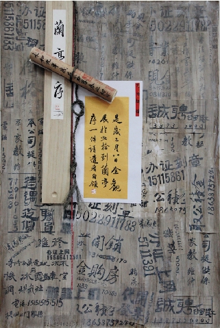 | 张高鹏 《失物招领》 解题:经济社会背景下,人们追名逐利,一部分人失去了自我,迷失了生活的方向。如同街头、社区常见的小广告充斥着我们的生活,有些甚至成为污染城市环境的牛皮癣,更甚者成为假证、开假发票、买假药等违法乱纪的温床。本作品以一则清新的经典书法作品的失物招领,重在表示对找回道德的迫切愿望,对正能量的弘扬。为此特别取以小广告作为背景以强调当下泛滥的时代性,以麻绳、天下第一行书、醒目的金纸和二王一路的优美书风居于作品正中,各种残缺鄙俗的小广告退于其后,形成高尚精致与低下粗俗、干净整洁与陈旧泛黄的强烈视觉对比。图像关系的善恶指向明确,对当下社会的思考皆含于其中。此外,用书法作品本身直接弘扬道德,展示正能量,也是对传统书法只重娱乐作用的一种突破。 |