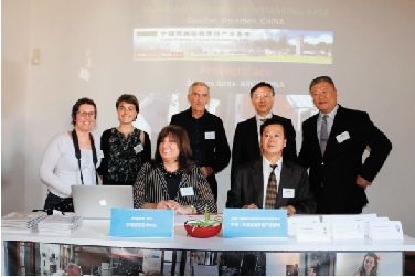 在龙华新区领导姜建军、胡晓清及对方代表的共同见证下,新区公共事业局局长骆秋雄代表观澜版画基地与阿塞艺术中心主席爱丽西亚签约。