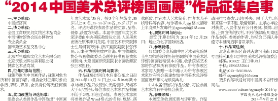 作品征集时间自本启事公布之日起至2014年10月31日止(以当地邮戳为准)参展作品只收原作,无需装裱,尺幅不大于6尺整张,每位参展艺术家作品数量不低于2幅,不超过6幅。参展艺术家须将参展作品Word格式的名称、规格、落款题跋、作者本人艺术简介、作者本人手机号码等内容,与作者本人jpg格式清晰上半身照片发邮件至zgmszpb@163.com