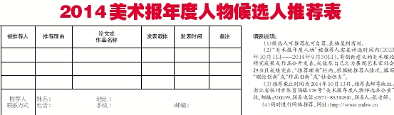 (3)推荐截止时间为2014年10月13日,推荐表邮寄地址:浙江省杭州市体育场路178号“美术报年度人物评选办公室”收,邮编:310039,联系电话:0571-85310810,联系人:张老师。
