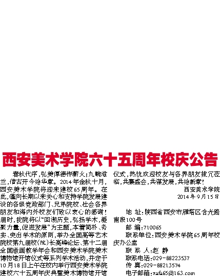 春秋代序,弘美厚德传薪火;九畹滋兰,借古开今绘华章。2014年金秋十月,西安美术学院将迎来建校65周年。在此,谨向长期以来关心和支持学院发展建设的各级党政部门、兄弟院校、社会各界朋友和海内外校友们致以衷心的感谢!届时,我院将以“回溯历史,弘扬学术,凝聚力量,促进发展”为主题,本着简朴、务实、突出学术的原则,举办全国高等艺术院校第九届校(院)长高峰论坛、第十二届全国版画教学年会和西安美术学院美术博物馆开馆仪式等系列学术活动,并定于10月18日上午在校内举行西安美术学院建校六十五周年庆典暨美术博物馆开馆仪式,热忱欢迎校友与各界朋友拔冗莅临,共襄盛会,共谋发展,共绘新章!