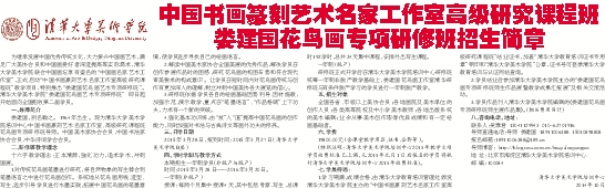 为继承发展中国优秀传统文化,大力振兴中国画艺术,满足广大美协会员和中国画爱好者深造提高等实际需求,清华大学美术学院联合中国画坛享有盛名的“中国画名家艺术工作室”,正式启动“中国书画篆刻艺术名家工作室高级研究课程班”教学项目,特别推出“娄建国花鸟画艺术专项研修班”。清华大学美术学院“娄建国花鸟画艺术专项研修班” 即日起开始面向全国招收第二届学员。