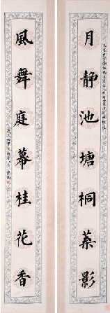 月静池塘桐叶影 风舞庭幕桂花香 尺寸:138×20.5cm×2 边跋:天香桂子落仙根月裹来人间好世界凉影映榭台 落款:岁在丙申花时令八月 溥儒