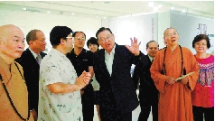 国民党中央委员会副主席、前海基会董事长江丙坤向观众解读孔维克作品(左起:释慧业、钟荣吉、孔维克、张鹏举、吕丽莉、江丙坤、张连兴、释净耀、萧雅文)
